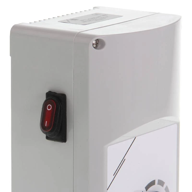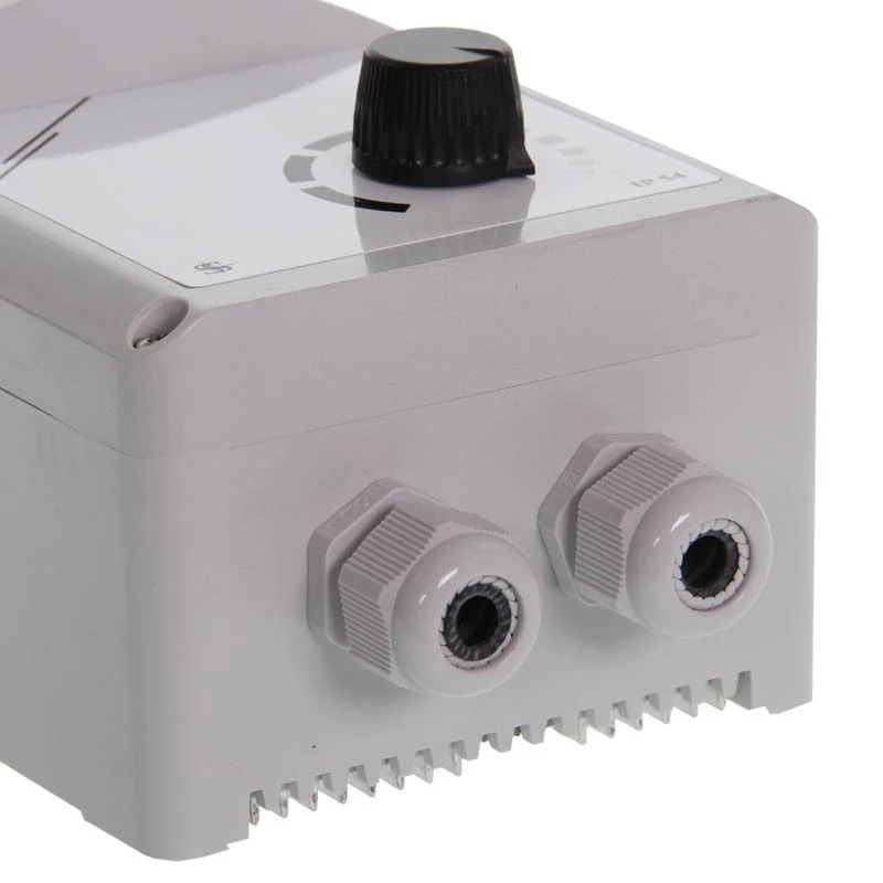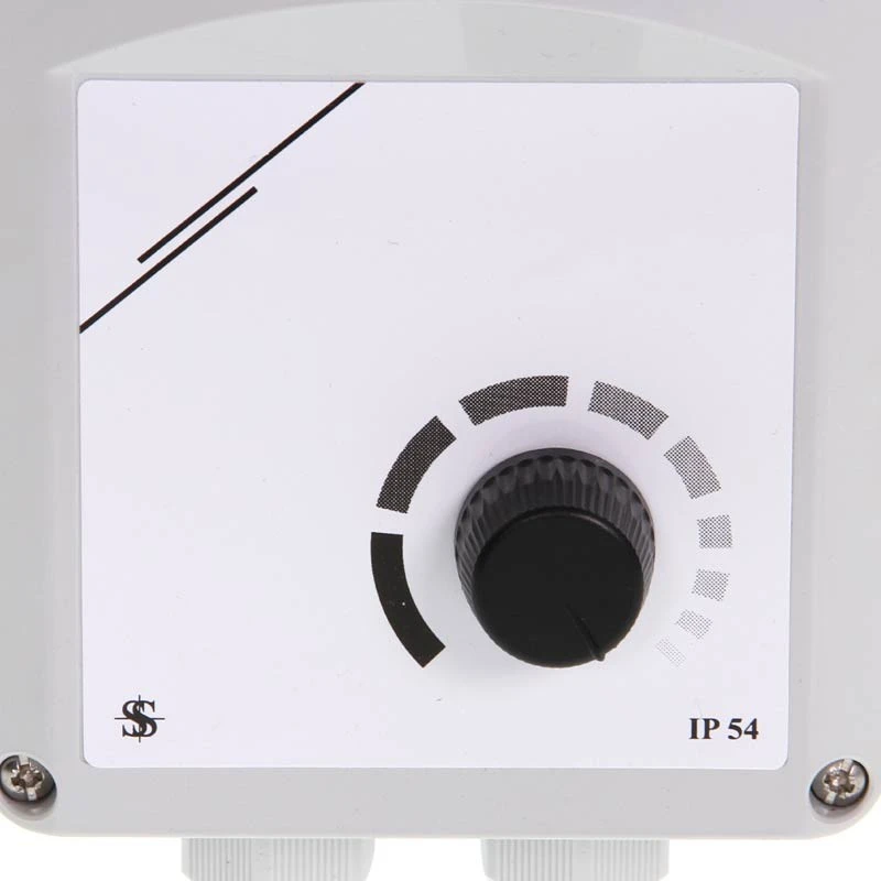 Questo regolatore a tiristori è un regolatore elettronico di velocità per ventilatori monofase in corrente alternata tramite controllo di fase. La velocità può essere regolata con il potenziometro rotante sul lato anteriore. L’ITR richiede una tensione di rete compresa tra 110 e 240 VAC, a 50-60 Hz. La corrente massima è di 6 A. È inoltre possibile scegliere tra l’avviamento a pedale o l’avviamento graduale e la velocità minima può essere regolata tramite un trimmer interno. Il regolatore di velocità a variazione continua è dotato di un interruttore on/off che consente di lasciare la velocità impostata. L’unità ha una classe di protezione IP54 ed è adatta al montaggio in superficie.