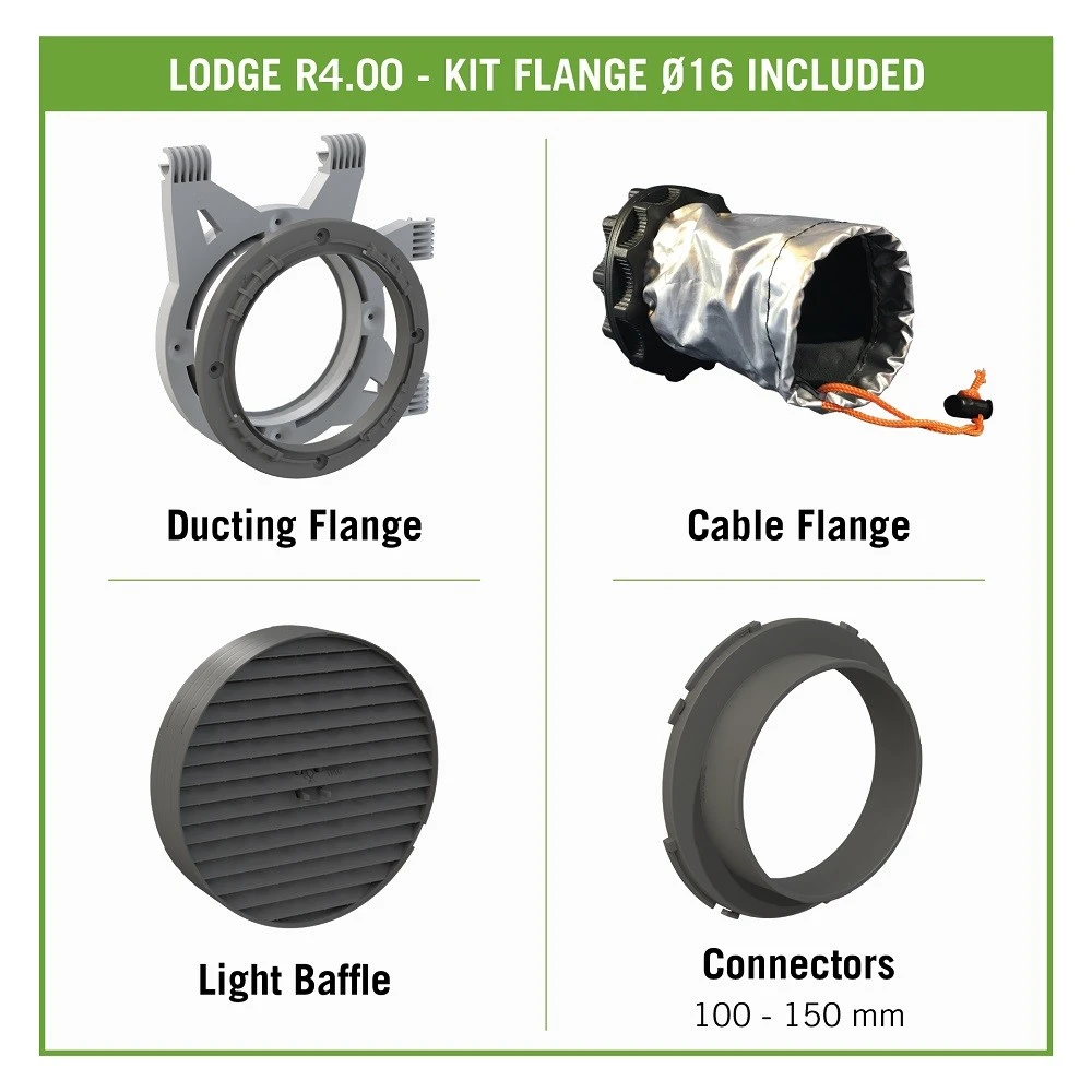Non ci sono cinghie nelle tende Lodge Growbox. Si consiglia di acquistare opzionalmente per il montaggio della vostra ventilazione il Set di 4 cinghie di fissaggio .