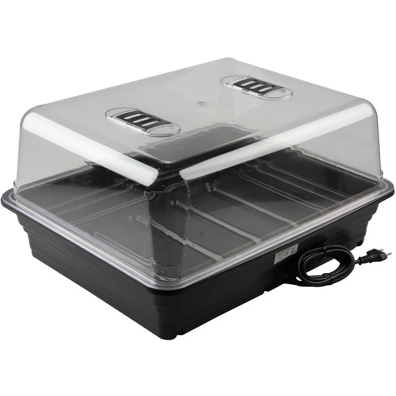 La base riscaldata contiene un elemento in fibra di carbonio da 22 watt per una distribuzione uniforme del calore. Questa serra non è termostatata ed è progettata per aumentare la temperatura ambiente del pavimento di circa 8° Celsius.
