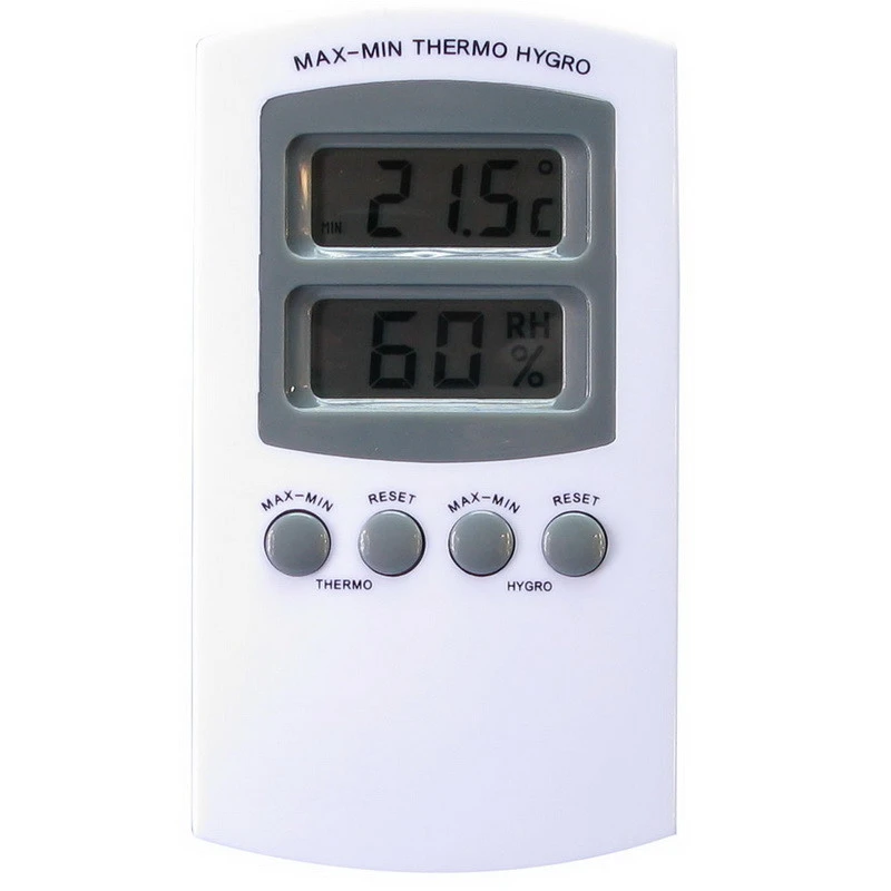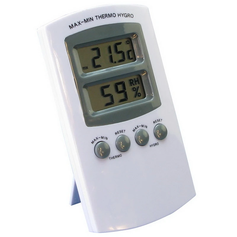 Un termometro digitale e igrometro con memoria per regolare la temperatura e l’umidità dell’aria negli ambienti. Alimentazione a batterie con una batteria AA da 1,5V.